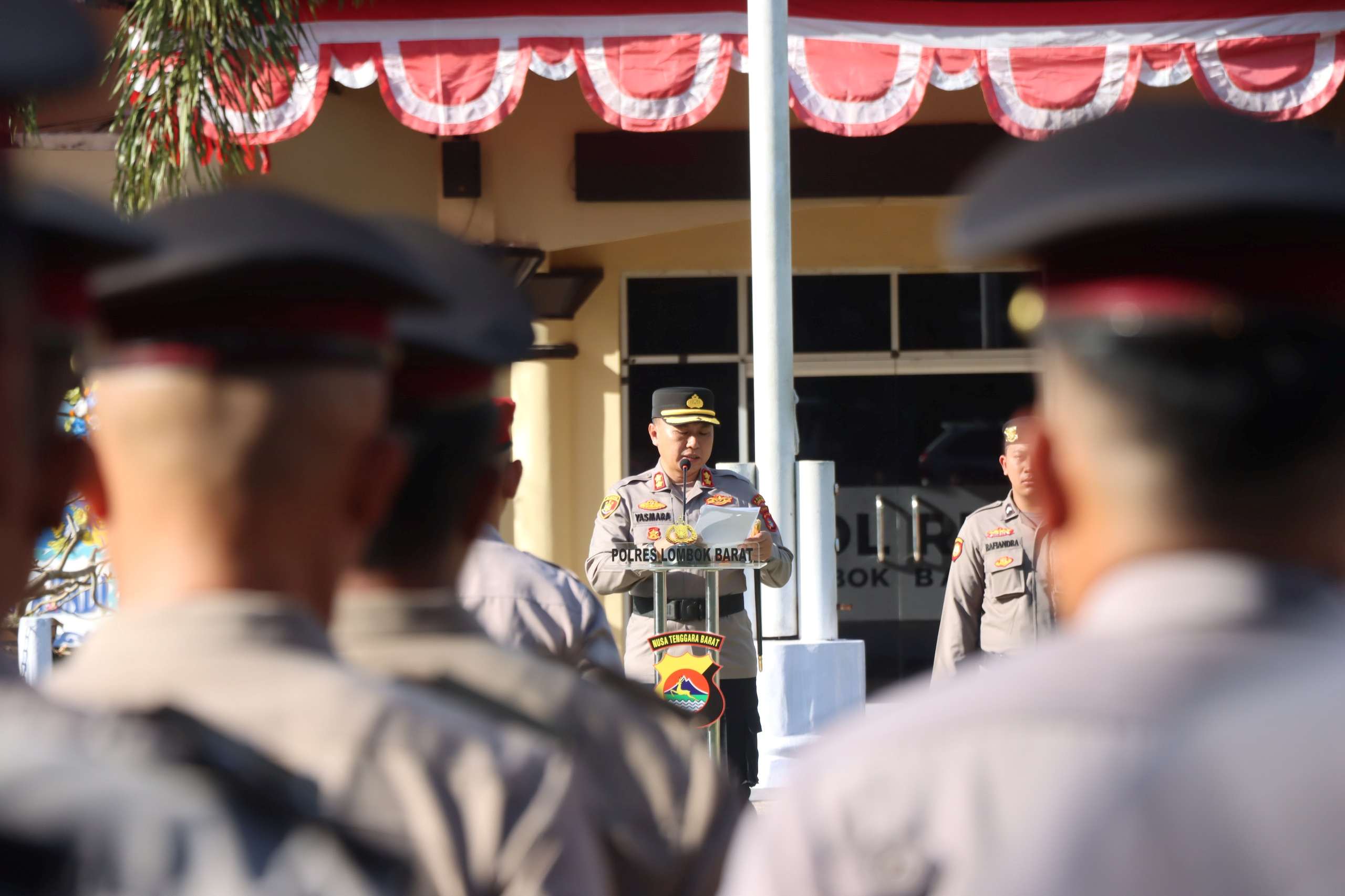 Upacara dipimpin langsung oleh Kapolres Lombok Barat, AKBP Yasmara Harahap, S.I.K. Turut hadir dalam kegiatan tersebut Wakapolres Lombok Barat, Kompol Kadek Matria, S.Sos., S.H., M.H., serta para Kabag, Kasat, dan Kapolsek jajaran Polres Lombok Barat.